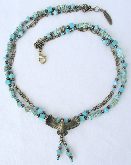 Shop This NecklaceThis 18" choker necklace is made with a brass bird charm, magnesite beads, and brass chain.