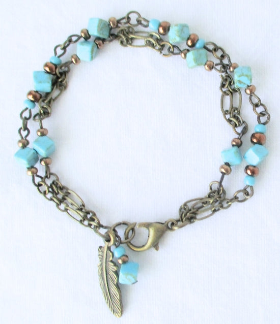 Shop This BraceletThis double-strand gemstone bracelet is made with blue magnesite beads and brass chain, ending in a lobster clasp and feather charm.